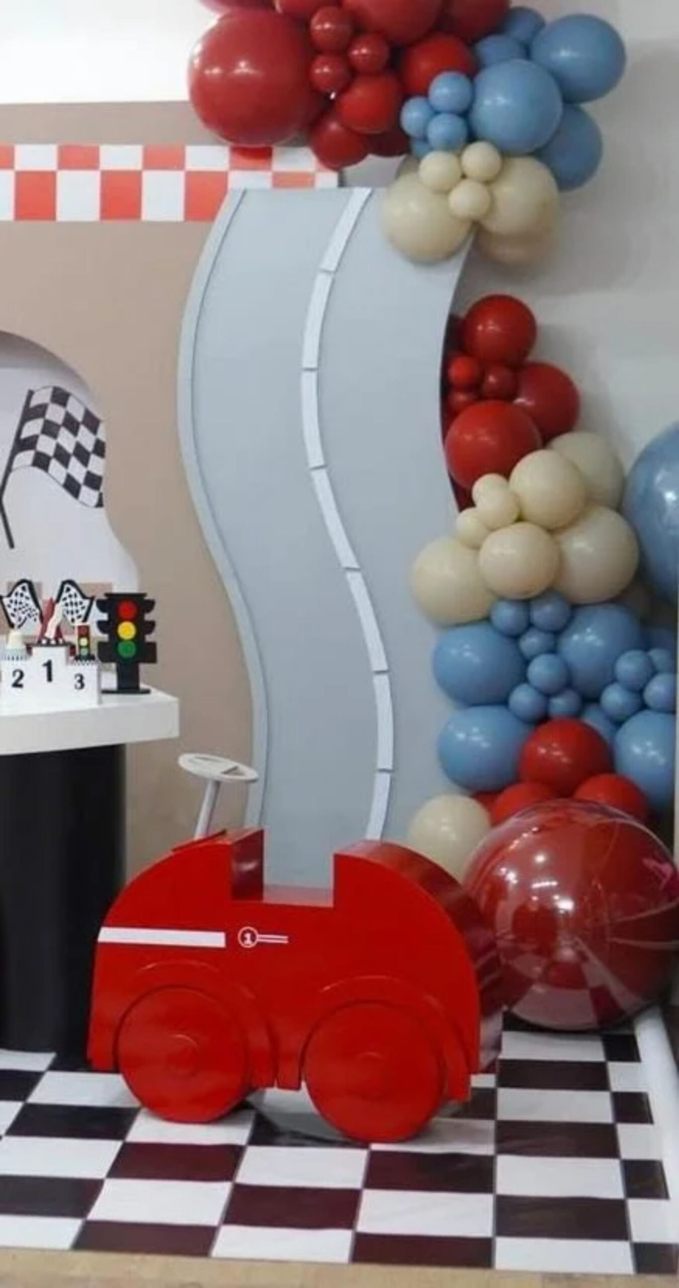 El espaldar curvo en madera es una estructura decorativa de diseño ideal para temáticas relacionadas con autos, carreras, Cars, marcas de autos o decoraciones que se inspiren en lo urbano.